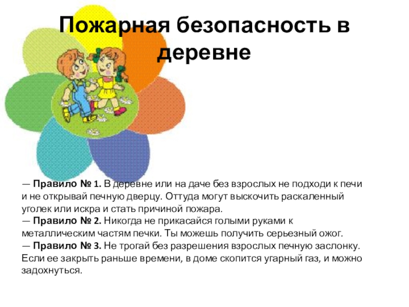 — Правило № 3. Не трогай без разрешения взрослых печную заслонку. Если ее закрыть раньше времени, в доме скопится угарный газ, и можно задохнуться.