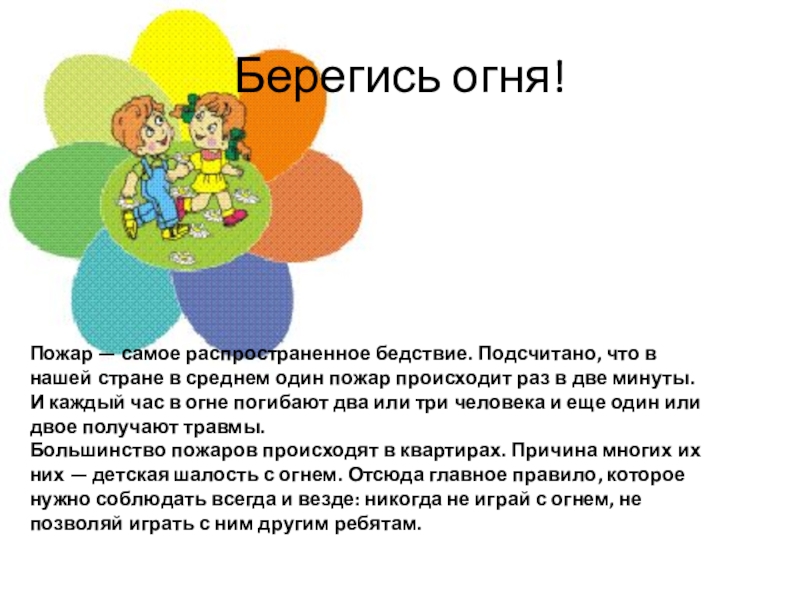 Большинство пожаров происходят в квартирах. Причина многих их них — детская шалость с огнем. Отсюда главное правило, которое нужно соблюдать всегда и везде: никогда не играй с огнем, не позволяй играть с ним другим ребятам.