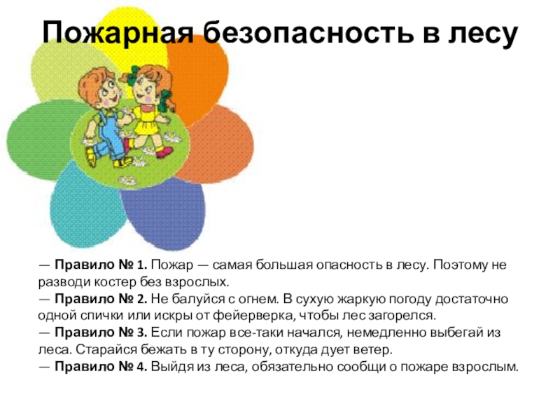 — Правило № 4. Выйдя из леса, обязательно сообщи о пожаре взрослым.