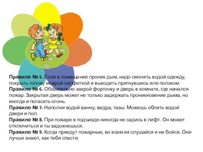 Правило № 5. Если в помещение проник дым, надо смочить водой одежду,
