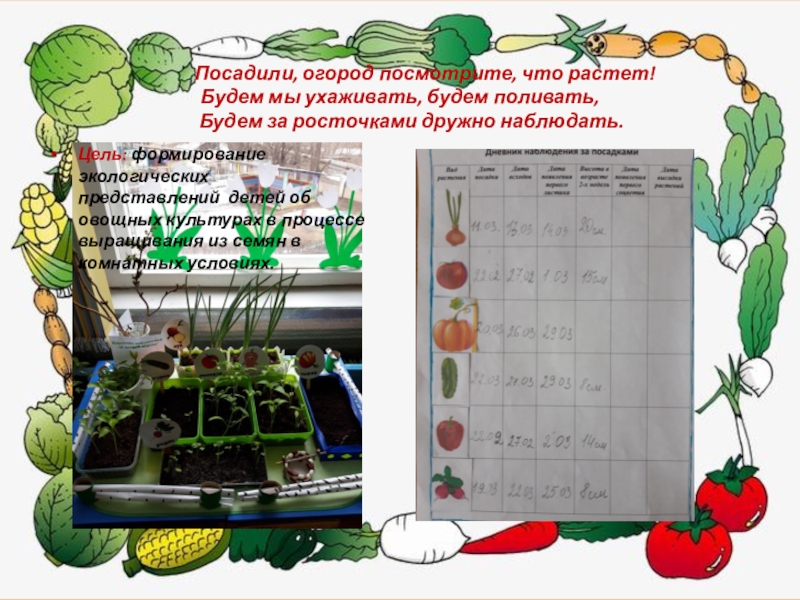 Цель: формирование экологических представлений детей об овощных культурах в процессе выращивания из семян в комнатных условиях.