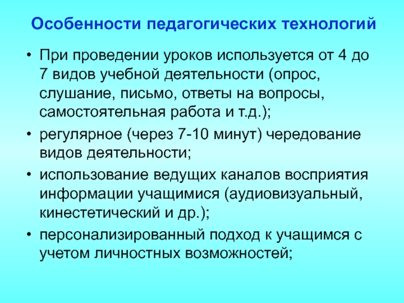 регулярное (через 7-10 минут) чередование видов деятельности;