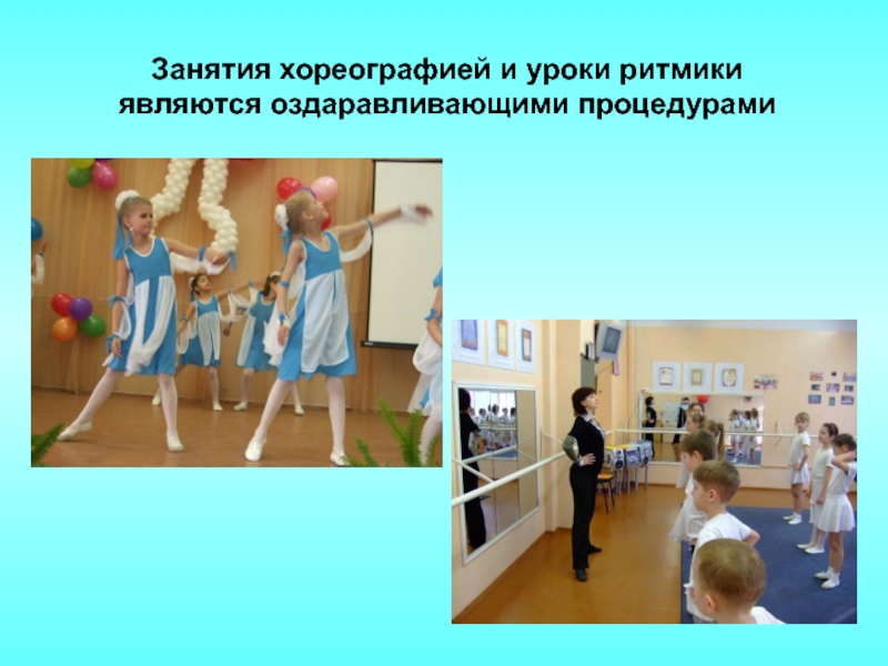 Слайд 23Занятия хореографией и уроки ритмики являются оздаравливающими процедурами