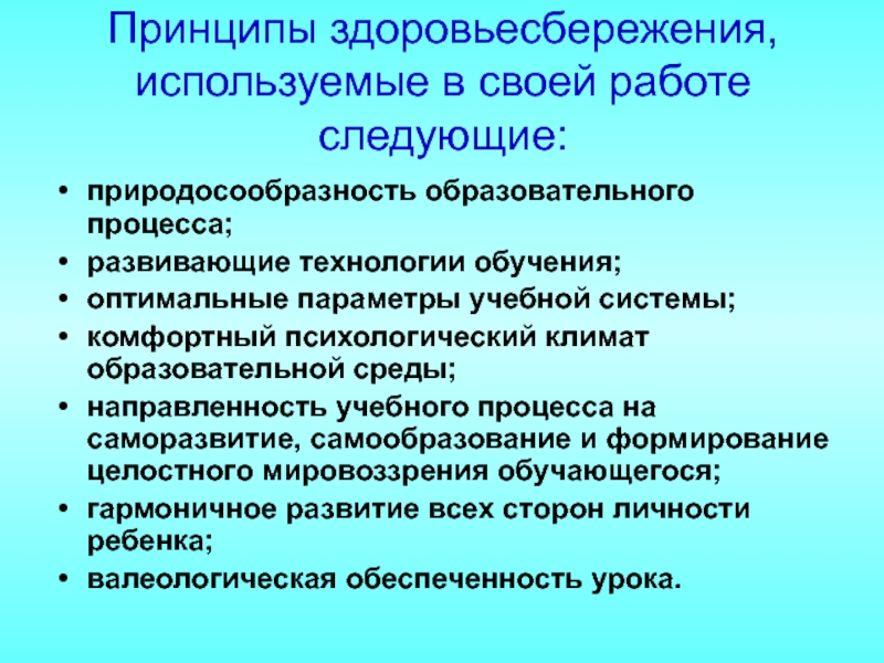 Слайд 20Принципы здоровьесбережения, используемые в своей работе следующие: