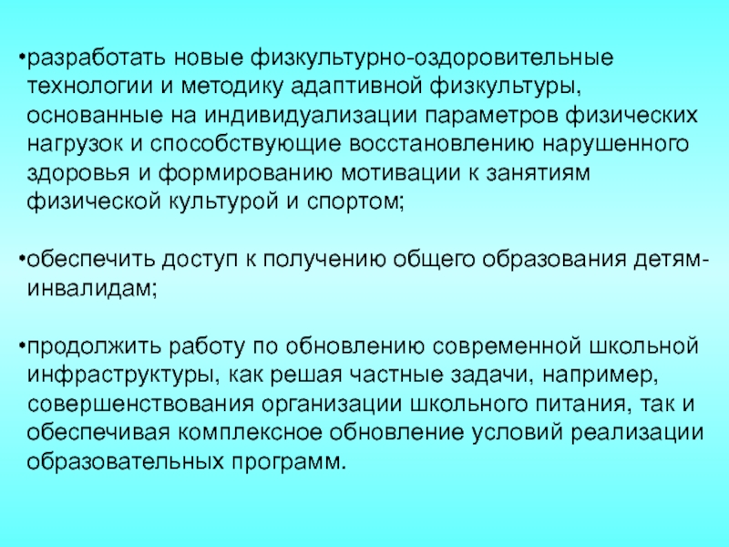 Слайд 12разработать новые физкультурно-оздоровительные технологии и методику адаптивной физкультуры, основанные на индивидуализации