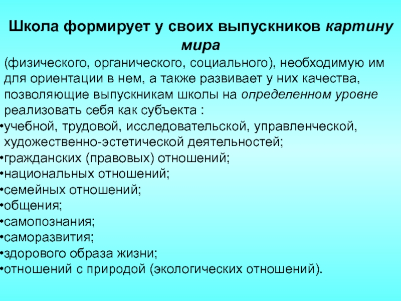 им для ориентации в нем, а также развивает у них качества, позволяющие выпускникам школы на определенном уровне реализовать себя как субъекта :