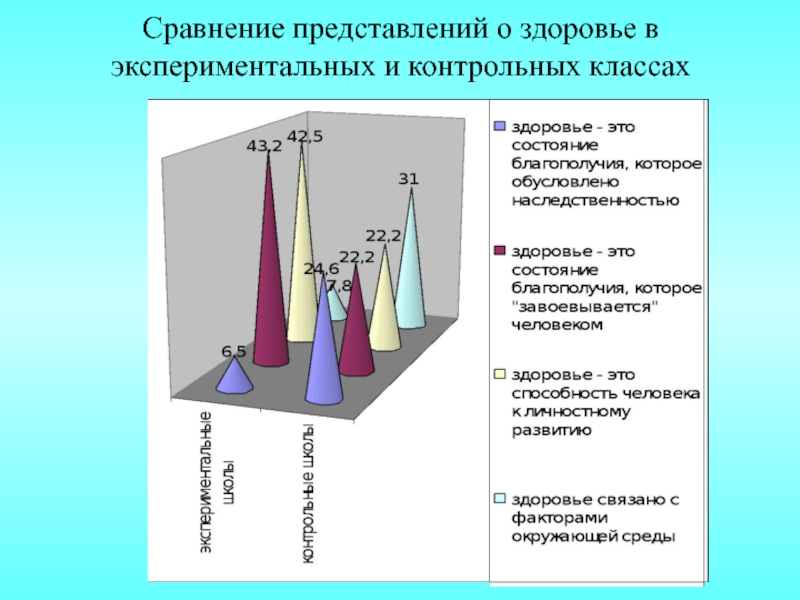 Слайд 35Сравнение представлений о здоровье в экспериментальных и контрольных классах
