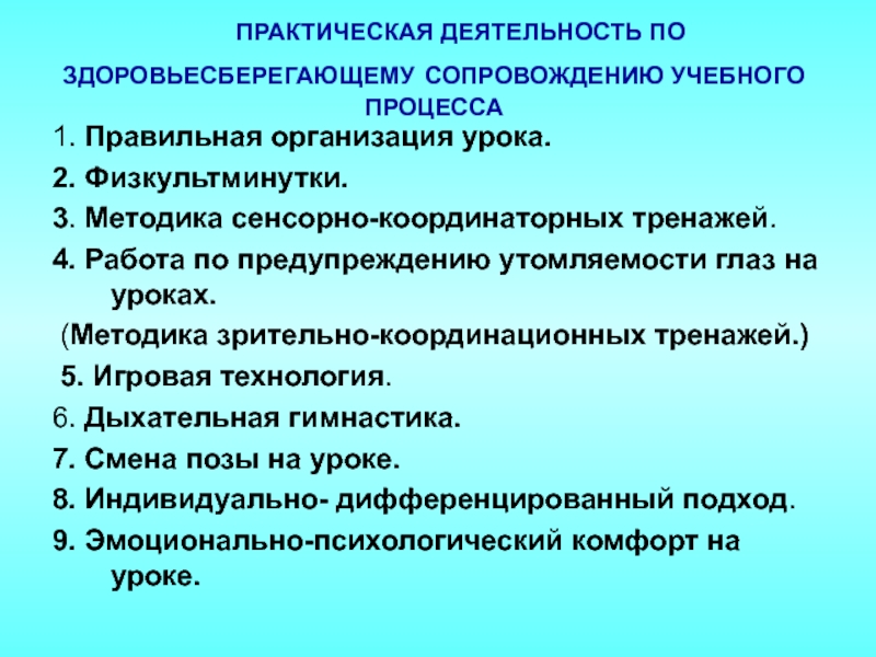 Слайд 33 ПРАКТИЧЕСКАЯ ДЕЯТЕЛЬНОСТЬ ПО ЗДОРОВЬЕСБЕРЕГАЮЩЕМУ СОПРОВОЖДЕНИЮ УЧЕБНОГО ПРОЦЕССА