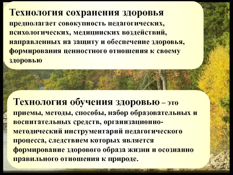 Технология обучения здоровью – это приемы, методы, способы, набор образовательных и воспитательных средств, организационно-методический инструментарий педагогического процесса, следствием которых является формирование здорового образа жизни и осознанно правильного отношения к природе.