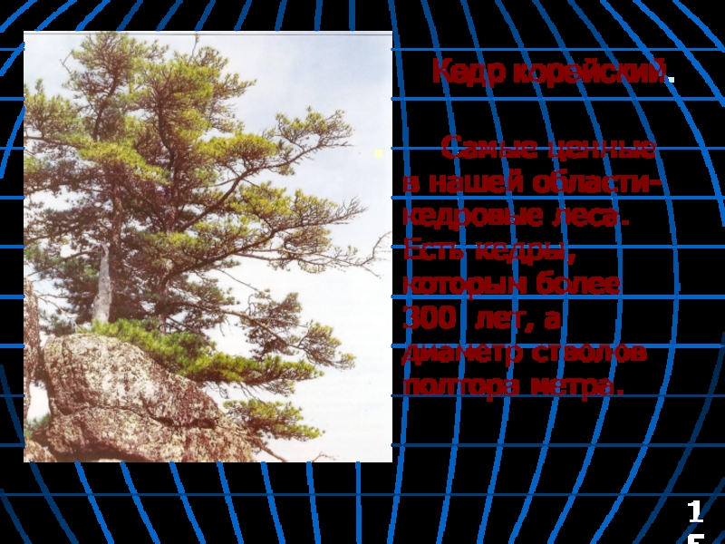 Самые ценные в нашей области- кедровые леса. Есть кедры, которым более 300 лет, а диаметр стволов полтора метра.