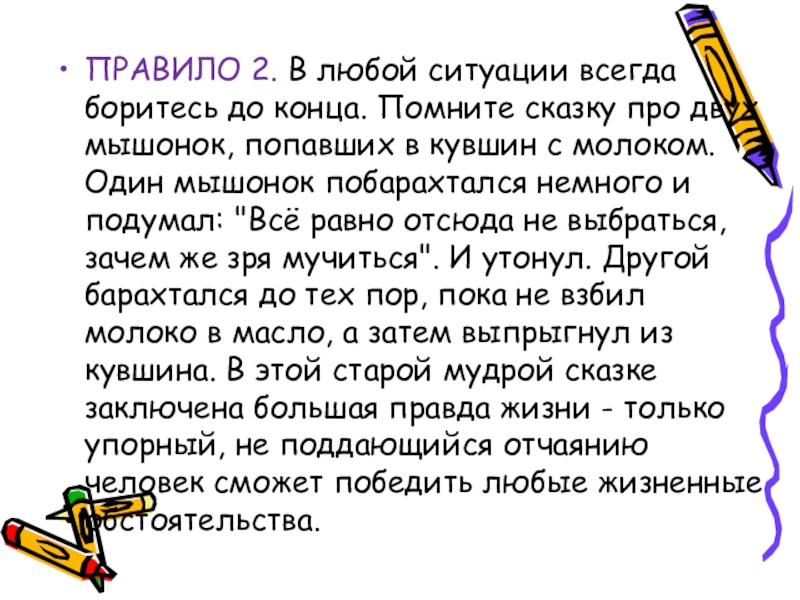 Слайд 20ПРАВИЛО 2. В любой ситуации всегда боритесь до конца. Помните сказку