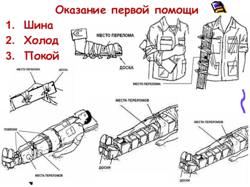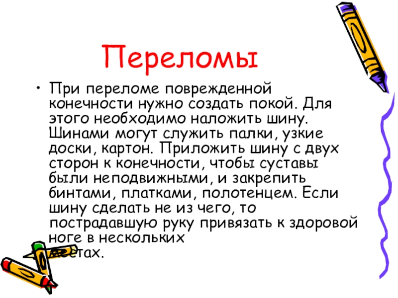 шину. Шинами могут служить палки, узкие доски, картон. Приложить шину с двух сторон к конечности, чтобы суставы были неподвижными, и закрепить бинтами, платками, полотенцем. Если шину сделать не из чего, то пострадавшую руку привязать к здоровой ноге в нескольких