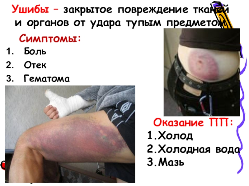 Слайд 8Ушибы – закрытое повреждение тканей и органов от удара тупым предметом