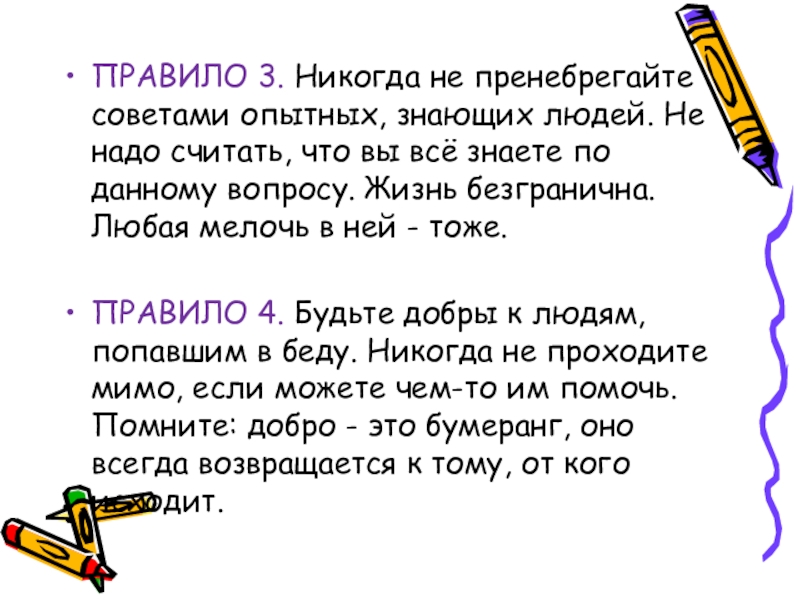 ПРАВИЛО 4. Будьте добры к людям, попавшим в беду. Никогда не проходите мимо, если можете чем-то им помочь. Помните: добро - это бумеранг, оно всегда возвращается к тому, от кого исходит.