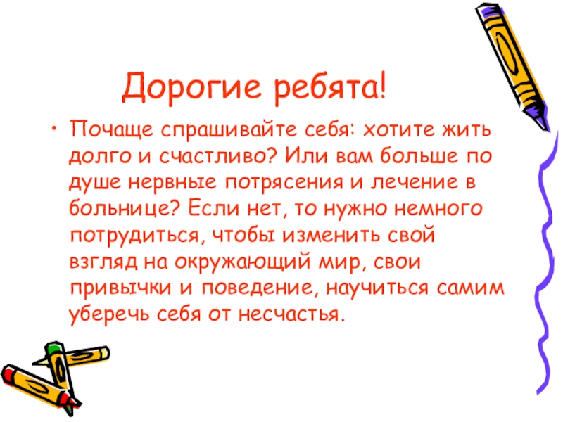 больше по душе нервные потрясения и лечение в больнице? Если нет, то нужно немного потрудиться, чтобы изменить свой взгляд на окружающий мир, свои привычки и поведение, научиться самим уберечь себя от несчастья.