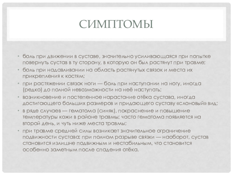 боль при надавливании на область растянутых связок и места их прикрепления к костям;