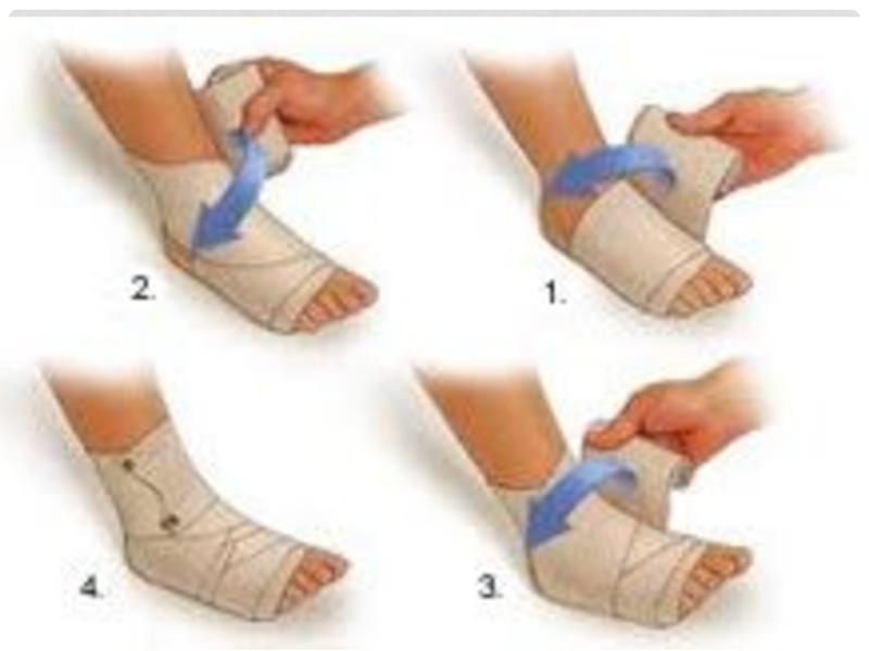 компрессия при помощи эластичного бинта, но перевязывая не слишком туго, чтобы конечность не немела и не приобретала ненормальный (бледный, синюшный) цвет;