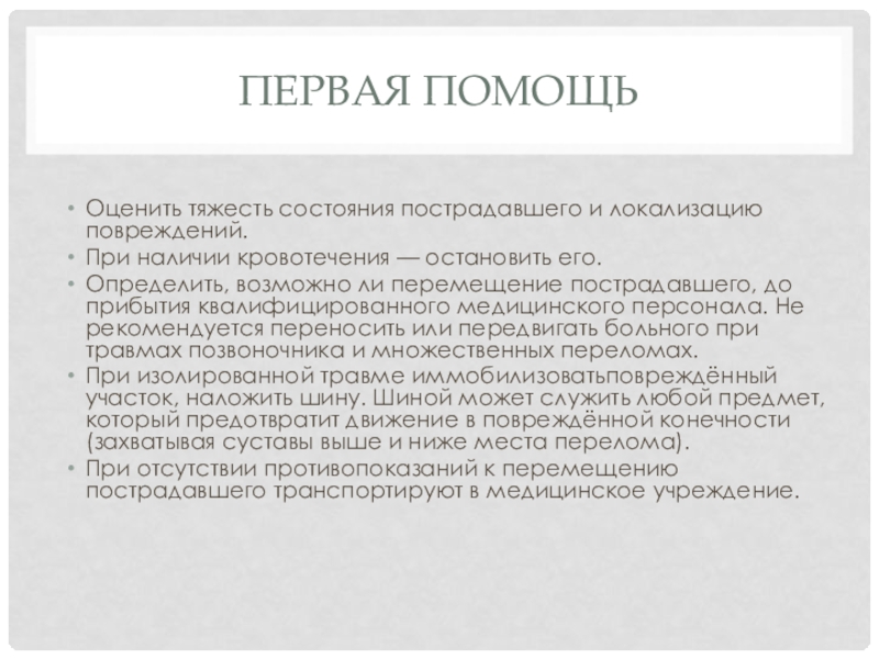 Определить, возможно ли перемещение пострадавшего, до прибытия квалифицированного медицинского персонала. Не рекомендуется переносить или передвигать больного при травмах позвоночника и множественных переломах.
