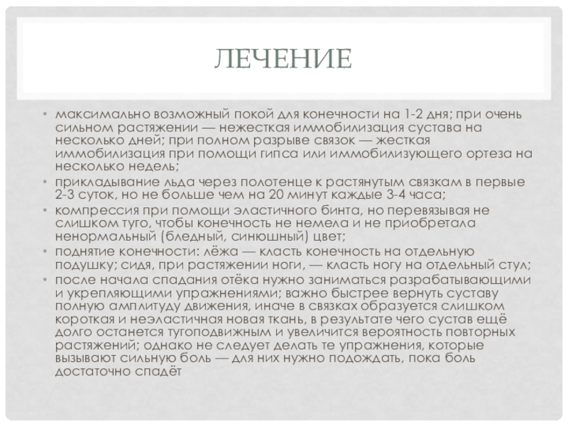 растяжении — нежесткая иммобилизация сустава на несколько дней; при полном разрыве связок — жесткая иммобилизация при помощи гипса или иммобилизующего ортеза на несколько недель;