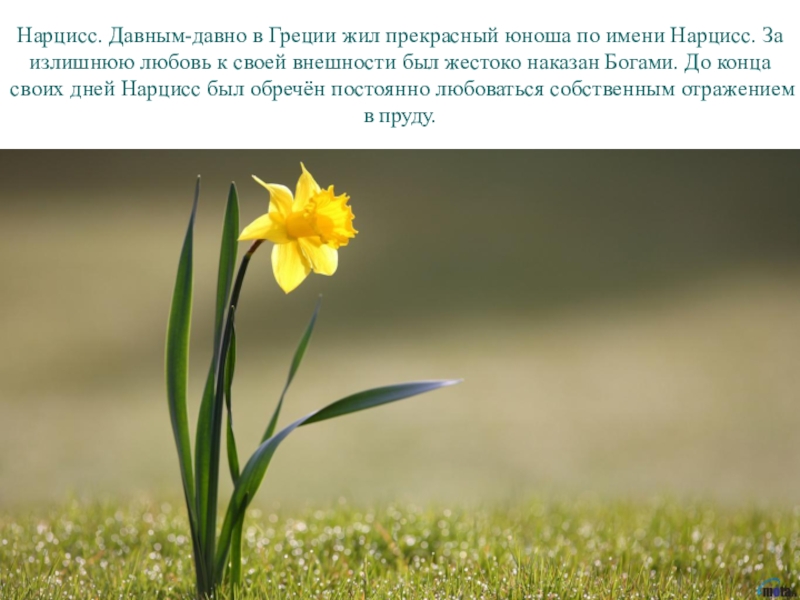 Нарцисс. Давным-давно в Греции жил прекрасный юноша по имени Нарцисс. За излишнюю любовь к своей внешности был
