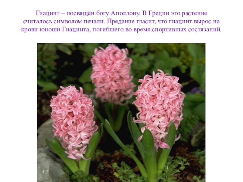 Слайд 8Гиацинт – посвящён богу Аполлону. В Греции это растение считалось символом