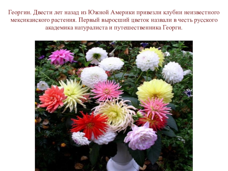 Слайд 12Георгин. Двести лет назад из Южной Америки привезли клубни неизвестного мексиканского