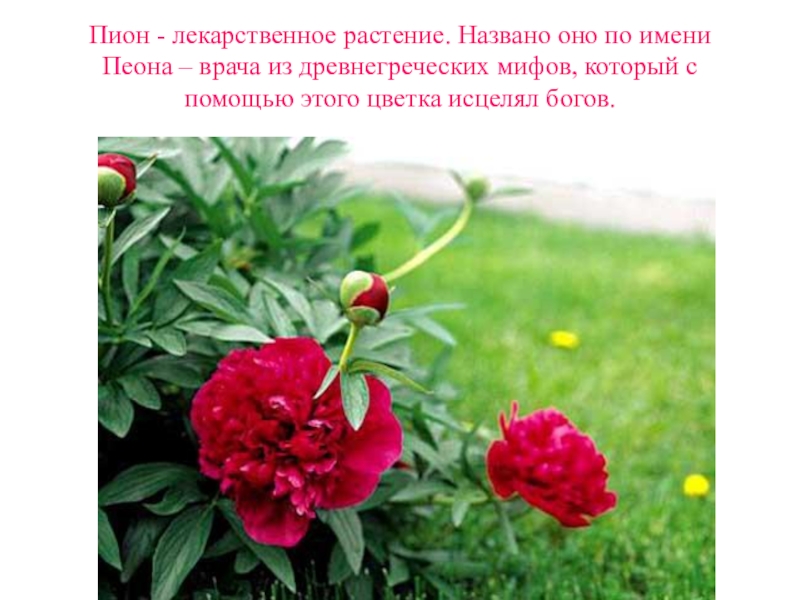 Пион - лекарственное растение. Названо оно по имени Пеона – врача из древнегреческих мифов, который с помощью