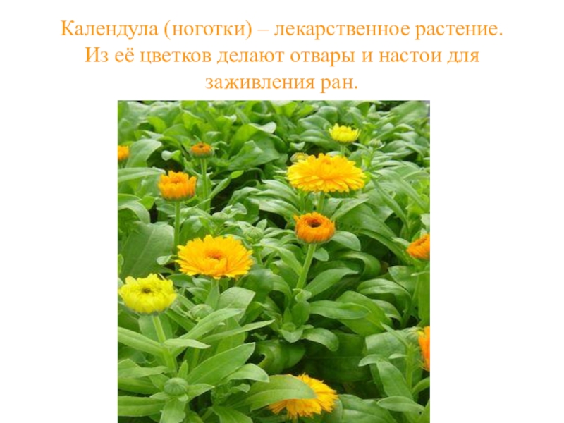 Слайд 4Календула (ноготки) – лекарственное растение. Из её цветков делают отвары и