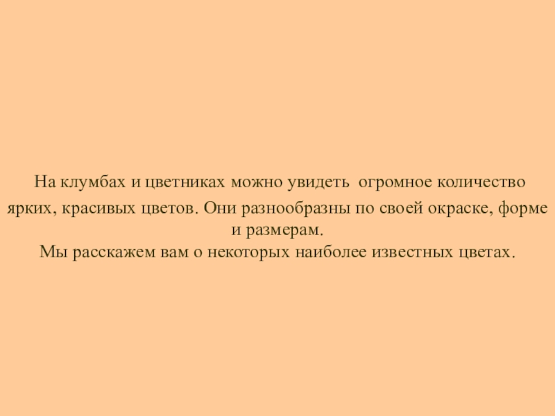 На клумбах и цветниках можно увидеть огромное количество ярких, красивых цветов. Они разнообразны по своей окраске, форме и размерам. Мы расскажем вам о некоторых наиболее известных цветах.