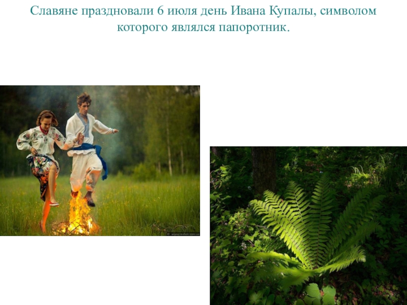 Слайд 15Славяне праздновали 6 июля день Ивана Купалы, символом которого являлся папоротник.