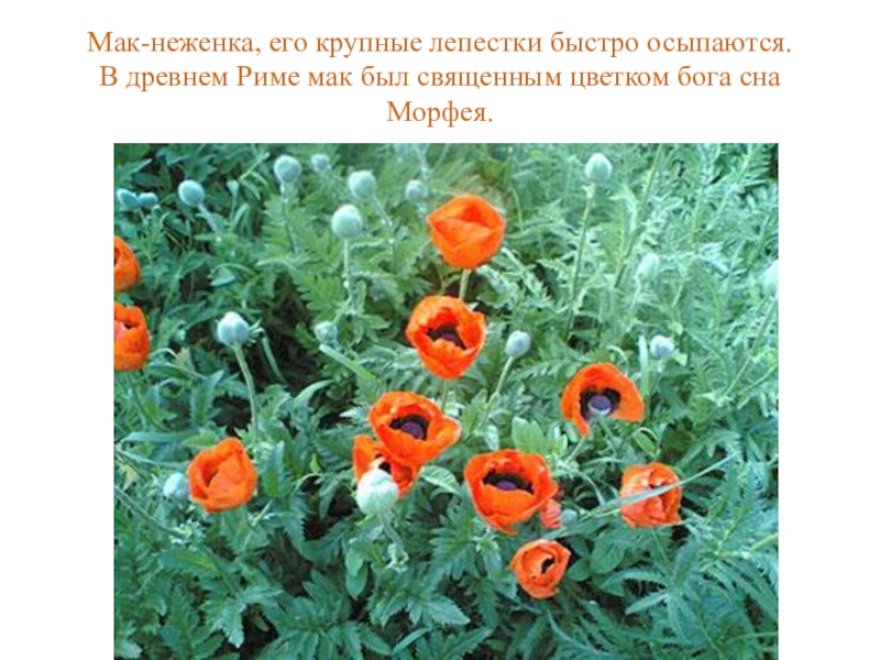 Слайд 5Мак-неженка, его крупные лепестки быстро осыпаются. В древнем Риме мак был