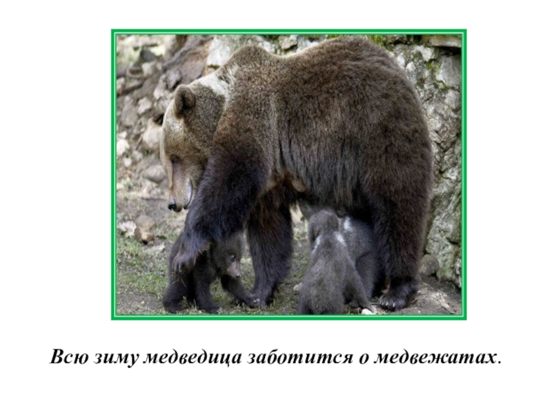 Слайд 5 Всю зиму медведица заботится о медвежатах.