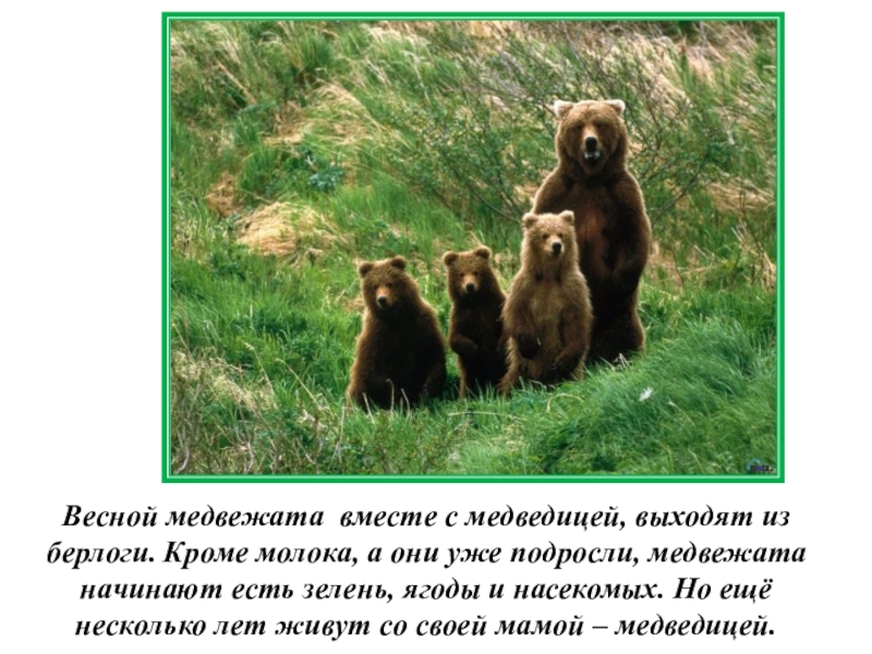 Слайд 6Весной медвежата вместе с медведицей, выходят из берлоги. Кроме молока, а