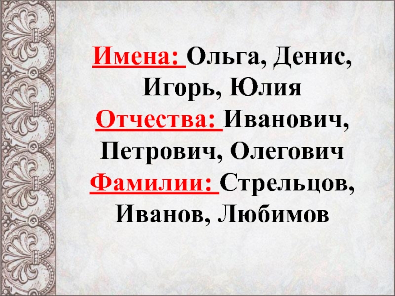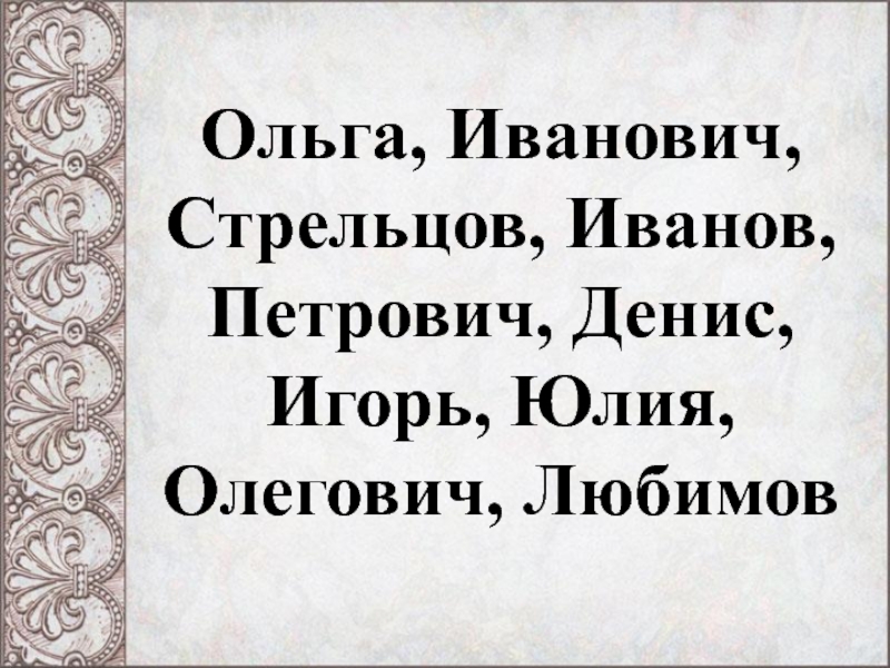Слайд 1Ольга, Иванович, Стрельцов, Иванов, Петрович, Денис, Игорь, Юлия, Олегович, Любимов