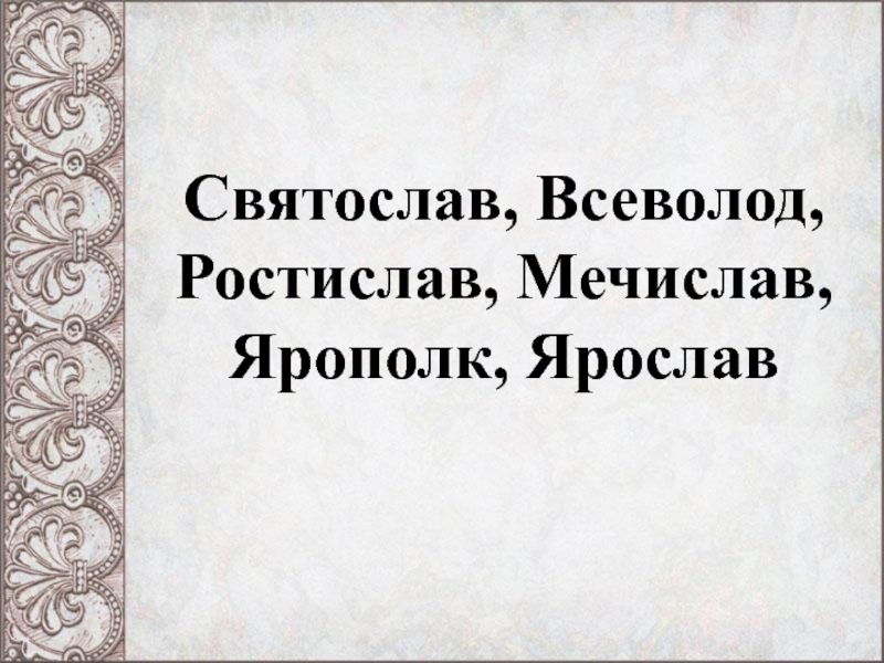 Слайд 6Святослав, Всеволод, Ростислав, Мечислав, Ярополк, Ярослав