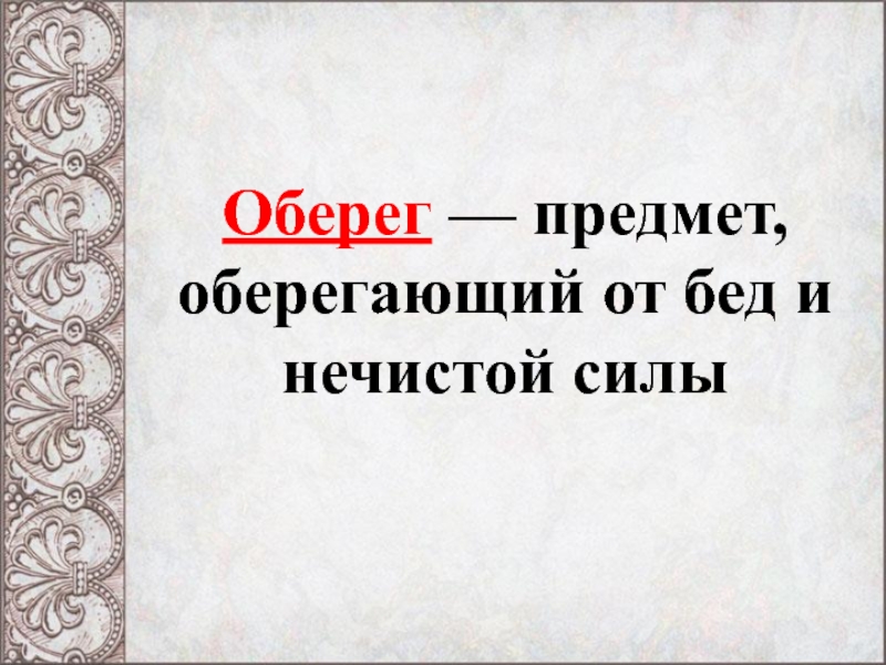 Слайд 5Оберег — предмет, оберегающий от бед и нечистой силы