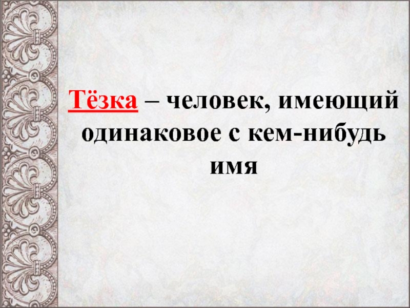 Слайд 4Тёзка – человек, имеющий одинаковое с кем-нибудь имя