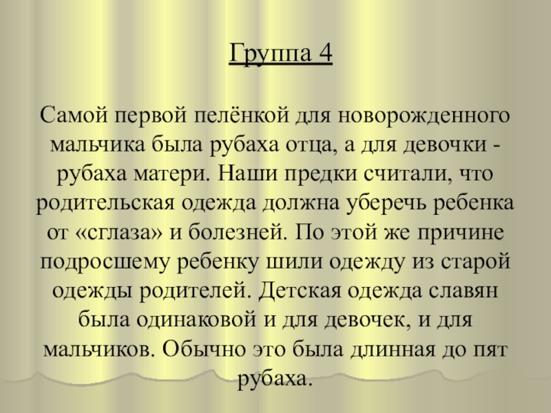 Группа 4Самой первой пелёнкой для новорожденного мальчика была рубаха отца, а для девочки - рубаха матери. Наши