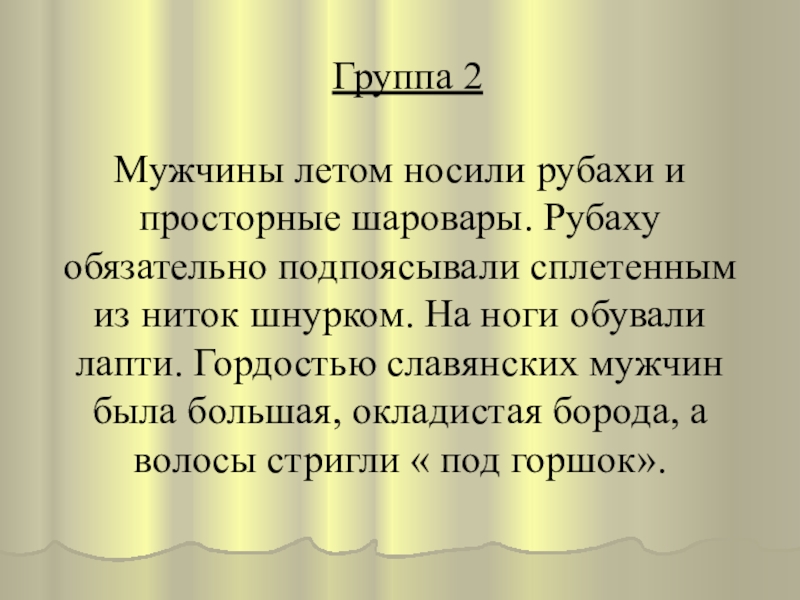 сплетенным из ниток шнурком. На ноги обували лапти. Гордостью славянских мужчин была большая, окладистая борода, а волосы стригли « под горшок».