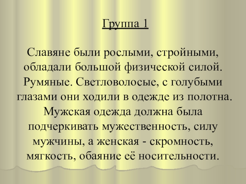 Группа 1Славяне были рослыми, стройными, обладали большой физической силой. Румяные. Светловолосые, с голубыми глазами они ходили в