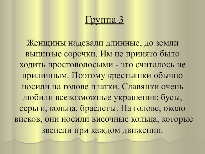 Группа 3Женщины надевали длинные, до земли вышитые сорочки. Им не принято было ходить простоволосыми - это считалось
