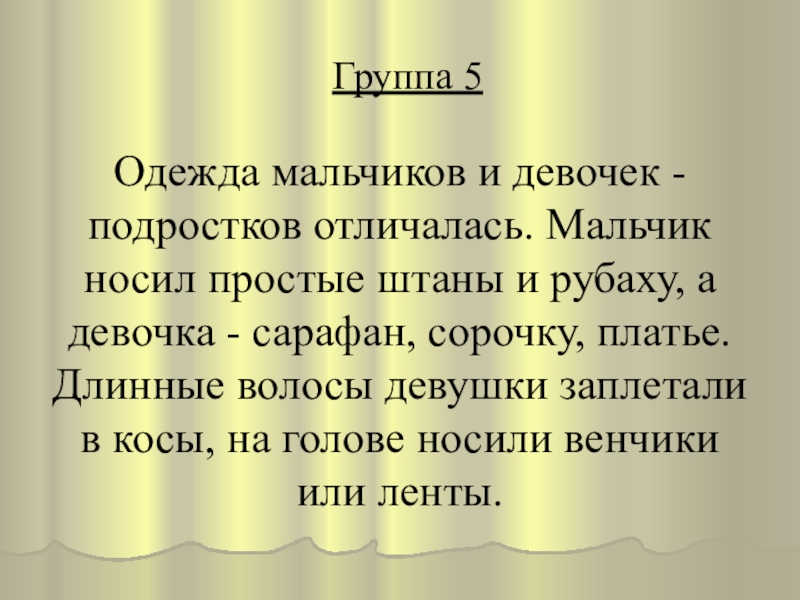 Группа 5Одежда мальчиков и девочек - подростков отличалась. Мальчик носил простые штаны и рубаху, а девочка -