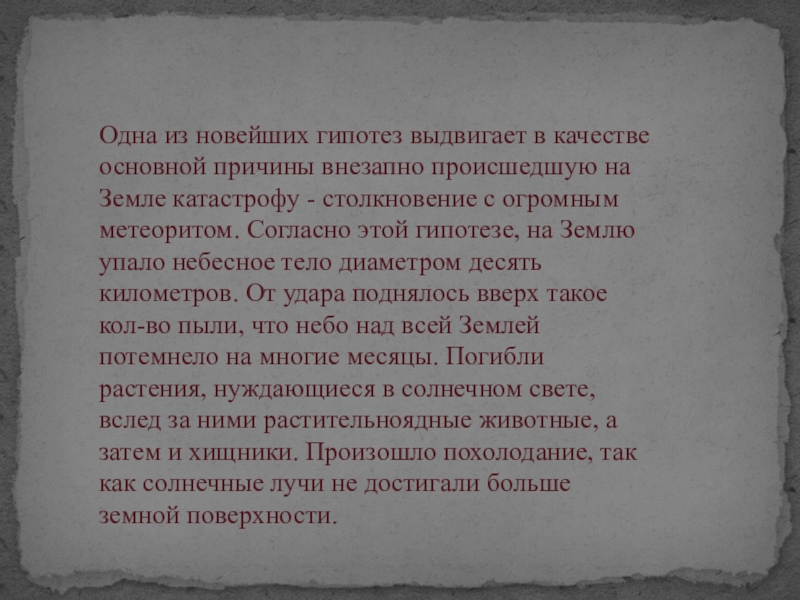 на Земле катастрофу - столкновение с огромным метеоритом. Согласно этой гипотезе, на Землю упало небесное тело диаметром десять километров. От удара поднялось вверх такое кол-во пыли, что небо над всей Землей потемнело на многие месяцы. Погибли растения, нуждающиеся в солнечном свете, вслед за ними растительноядные животные, а затем и хищники. Произошло похолодание, так как солнечные лучи не достигали больше земной поверхности.