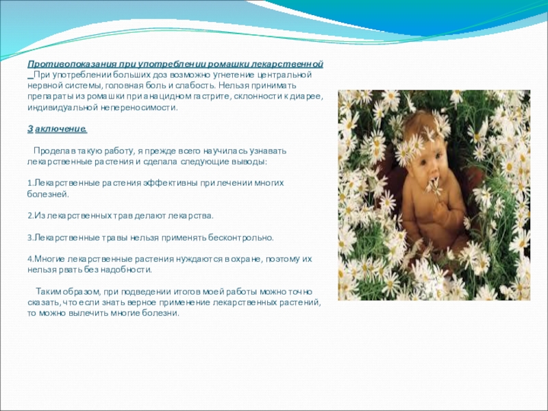 Таким образом, при подведении итогов моей работы можно точно сказать, что если знать верное применение лекарственных растений, то можно вылечить многие болезни.