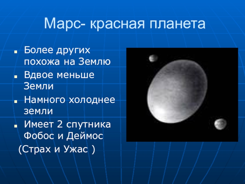 Марс- красная планетаБолее других похожа на ЗемлюВдвое меньше ЗемлиНамного холоднее землиИмеет 2 спутника Фобос и Деймос (Страх