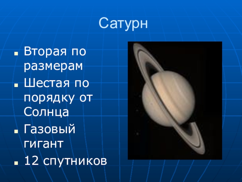 СатурнВторая по размерам Шестая по порядку от СолнцаГазовый гигант12 спутников