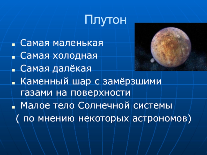 ПлутонСамая маленькаяСамая холоднаяСамая далёкая Каменный шар с замёрзшими газами на поверхностиМалое тело Солнечной системы ( по мнению