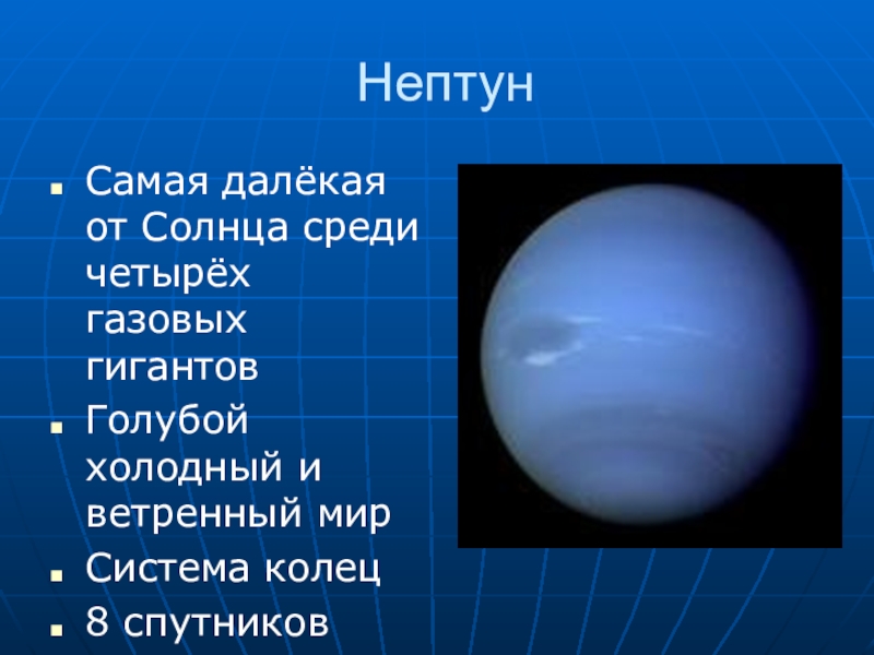 НептунСамая далёкая от Солнца среди четырёх газовых гигантовГолубой холодный и ветренный мирСистема колец8 спутников