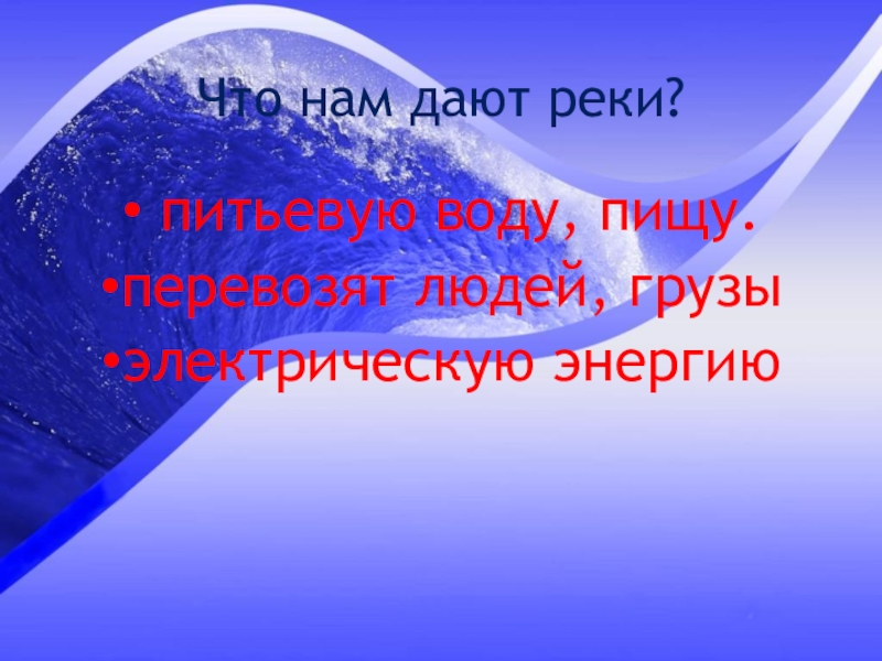 Что нам дают реки? питьевую воду, пищу.перевозят людей, грузыэлектрическую энергию
