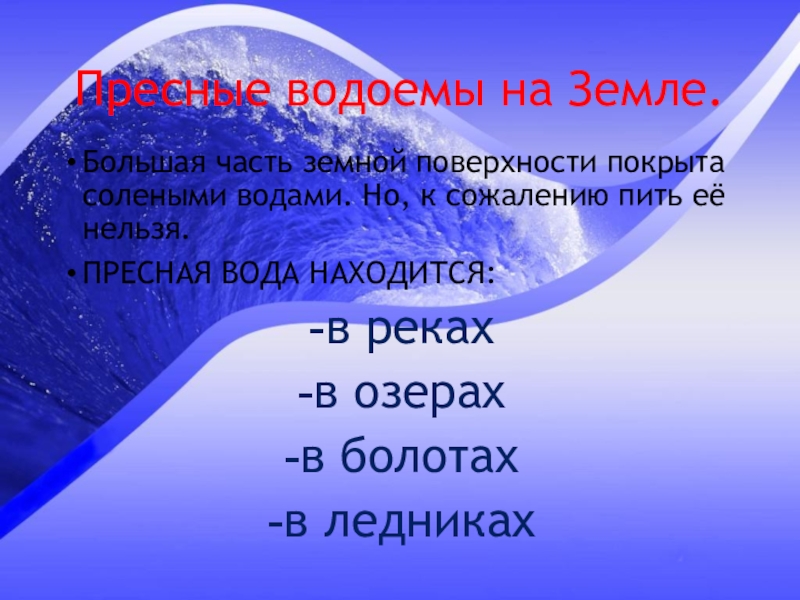 Пресные водоемы на Земле.Большая часть земной поверхности покрыта солеными водами. Но, к сожалению пить её нельзя.ПРЕСНАЯ ВОДА